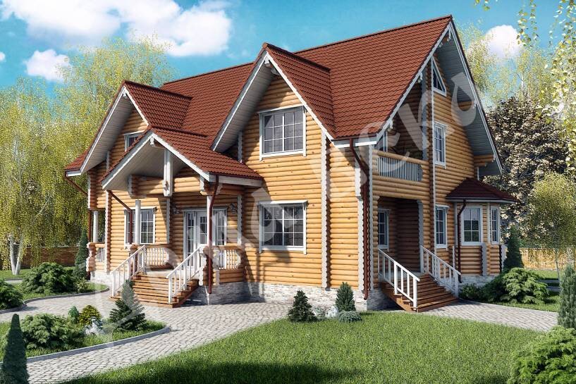 Проект строительства двухэтажного дома из оцилиндрованного бревна (300 мм — максимальный диаметр). Размеры первого этажа — 13,36 х 15,72 м, второго — 10 х 14,66 м.