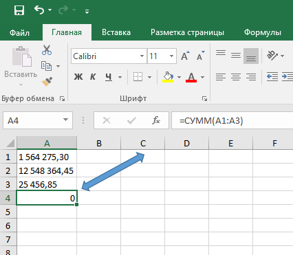 В ячейке А4 формула СУММ(А1:А3) , которая суммирует данные из ячеек А1, А2, А3, но как видим результат «0»