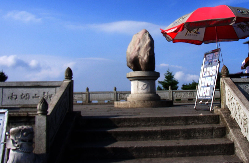Впрочем как карабкаться! По широченной мраморной лестнице с перилами между высоких елей торжественно поднимаешься на вершину Чжужун (около 1330), где высится огромный храм прямо над высоченной пропастью. Чжужун - воинственная амазонка древности. связанная с культом огня (Янь-ди). Перед вершиной - большая площадка для наблюдения луны с "первояйцом", выше - печи для сжигания подношений духам и на самом верху полукругом стоит даосский храм. За храмом можно проёти между огромными камнями над пропастью и посмотреть вниз - с вершины открывается величественный вид на все четыре стороны. Там же даосы выдадут Вам чудодейственные амулеты. Вершину посещает много студентов - и тут всегда живо и весело.