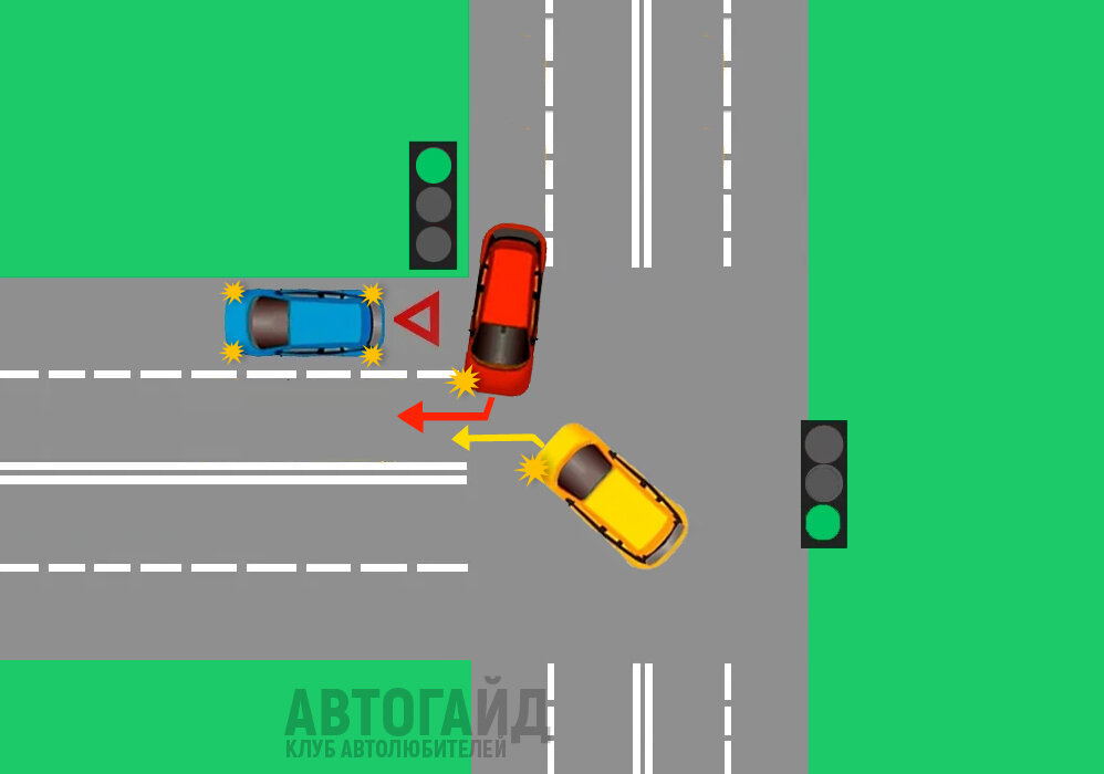 Разберем задачку ПДД. которая некоторым может показаться сложной. Допустим вы управляете желтой машиной, впереди перекресток и вы хотите повернуть налево. Для этого перестраиваетесь на крайнюю левую полосу, включаете поворотник. Однако напротив замечаете другое красное авто, которое собирается повернуть направо и моргает правым поворотником.