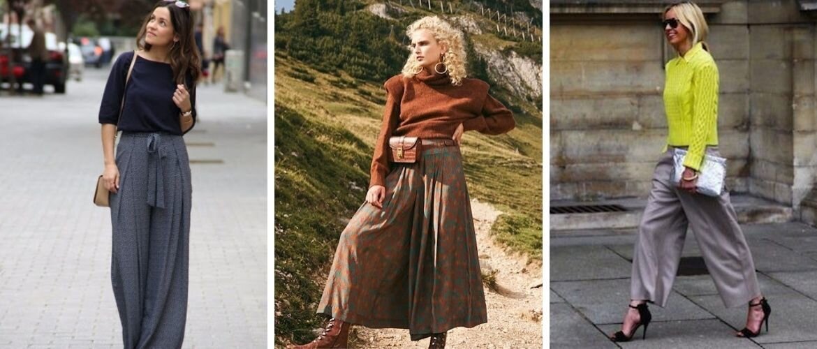 Для осенних луков мода предлагает имиджевые юбку-брюки из плотных и теплых тканей: шерсть, твид, фланель, трикотаж, деним, кожа. Верх надо выбирать в зависимости от ситуации. Поскольку этот фасон весьма приветствуется в деловом стиле, то бизнес-леди выбирают шелковую блузу, рубашку в полоску, приталенный жакет или этот вариант с поясом. Рубашку или блузку следует носить заправленной — это лучший способ продемонстрировать форму юбки-брюк и придать фигуре вид песочных часов. Укороченная джинсовая куртка или пиджак уравновешивает бедра, делая плечи визуально шире.
