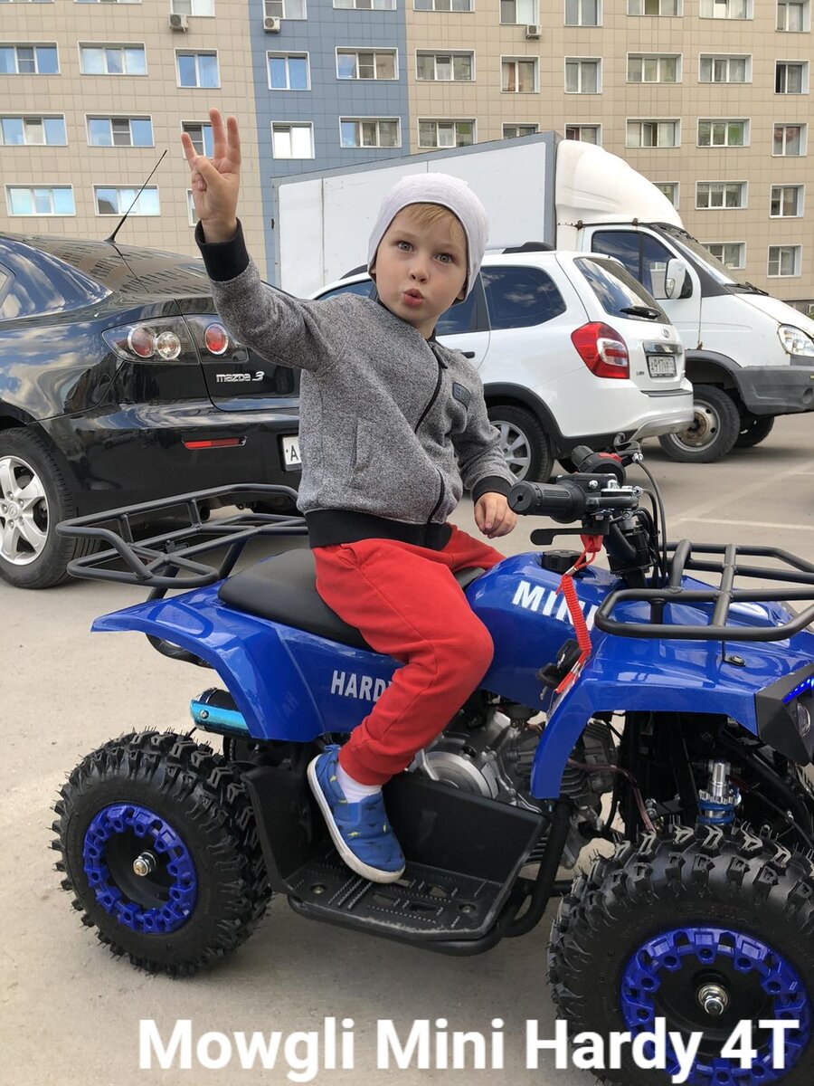 Безусловный лидер среди квадроциклов до 7 лет. Отличительной особенностью от конкурентов является четырехтактный двигатель объемом 50 куб. см., что делает его менее шумным, в отличии от конкурентов с 2-х тактными двигателями. Модель MOWGLI MINI HARDY 4T появилась на рынке около года назад. Также квадроцикл имеет непривычный для нас яркий дизайн с большим выбором цветов, отличную светодиодную оптику и хорошую внедорожную резину. Он снабжен всеми функциями безопасности: