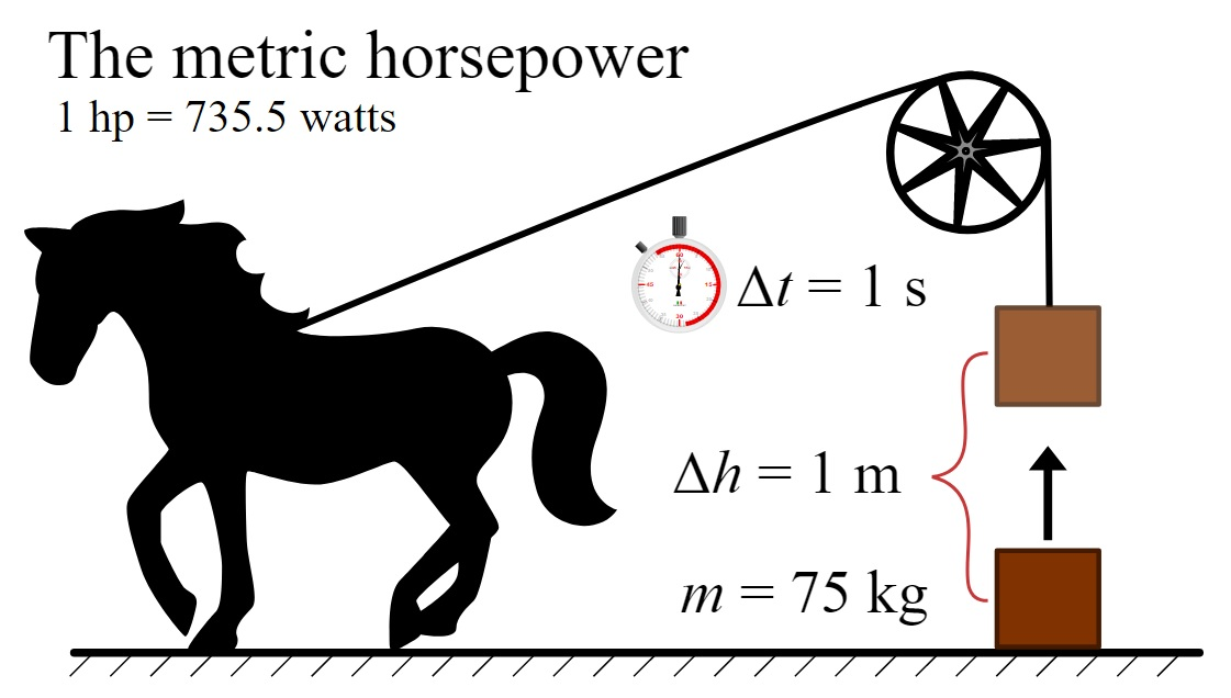 Приблизительно в 1789 году Джеймс Уатт ввел термин «лошадиная сила», чтобы показать, работу скольких лошадей способны заменить его паровые машины. В частности, утверждается, что одну из первых машин Уатта купил пивовар, чтобы заменить ею лошадь, которая приводила в действие водяной насос. Согласно распространенной легенде, при этом пивовар решил сжульничать, выбрав самую сильную лошадь и заставив её работать на пределе сил. Уатт принял и даже превысил полученную пивоваром цифру, и эталоном стала именно мощность построенной машины, несмотря на то что реальная мощность, которую развивает лошадь при нормальной работе в течение продолжительного времени, значительно меньше — по некоторым оценкам, в полтора раза.