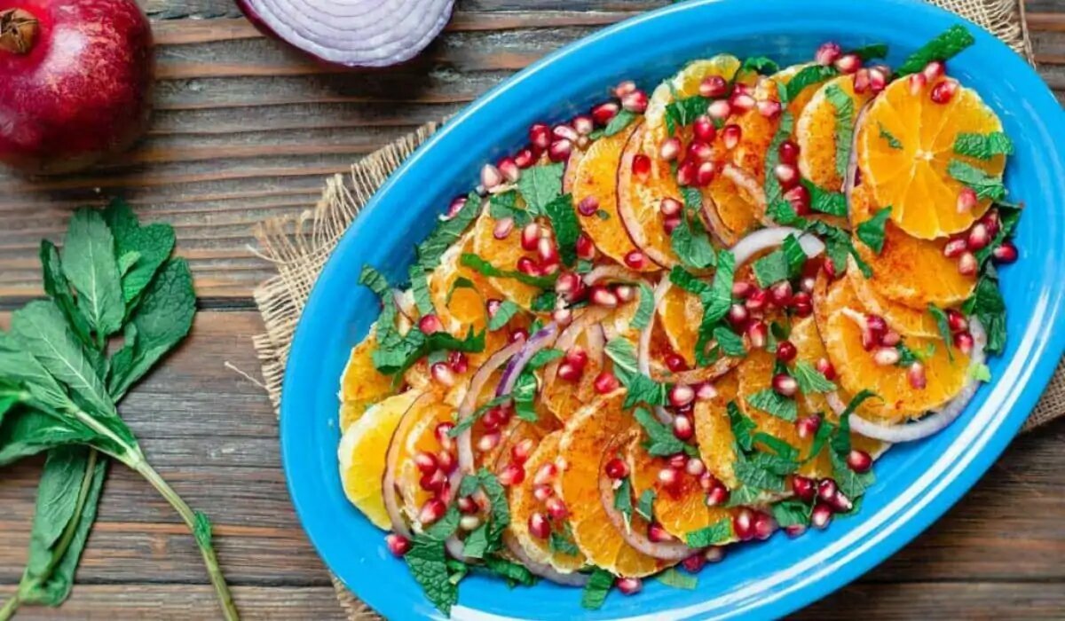 Пришло время сервировки. Приготовьте плоское блюдо. На его дно насыпьте половину нарезанной мяты, затем аккуратно уложите кусочки апельсина. Сверху посыпьте луковыми полукольцами. Добавляем специи и соль. Украшаем зернами граната и поливаем заправкой. Посыпаем оставшейся мятой и можно подавать на стол. Приятного аппетита!