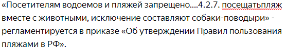 Главой МЧС РФ Е. Зиничевым утверждены нормативные правила по организации безопасности для посетителей пляжей на территории РФ. Нормативы вступят в силу, начиная с нового 2021 года. Согласно новым нормативным требованиям будет запрещено посещать водоемы вместе с питомцами, за исключением собак-поводырей. Соответствующие изменения были обнародованы в среду на официальной странице правовых