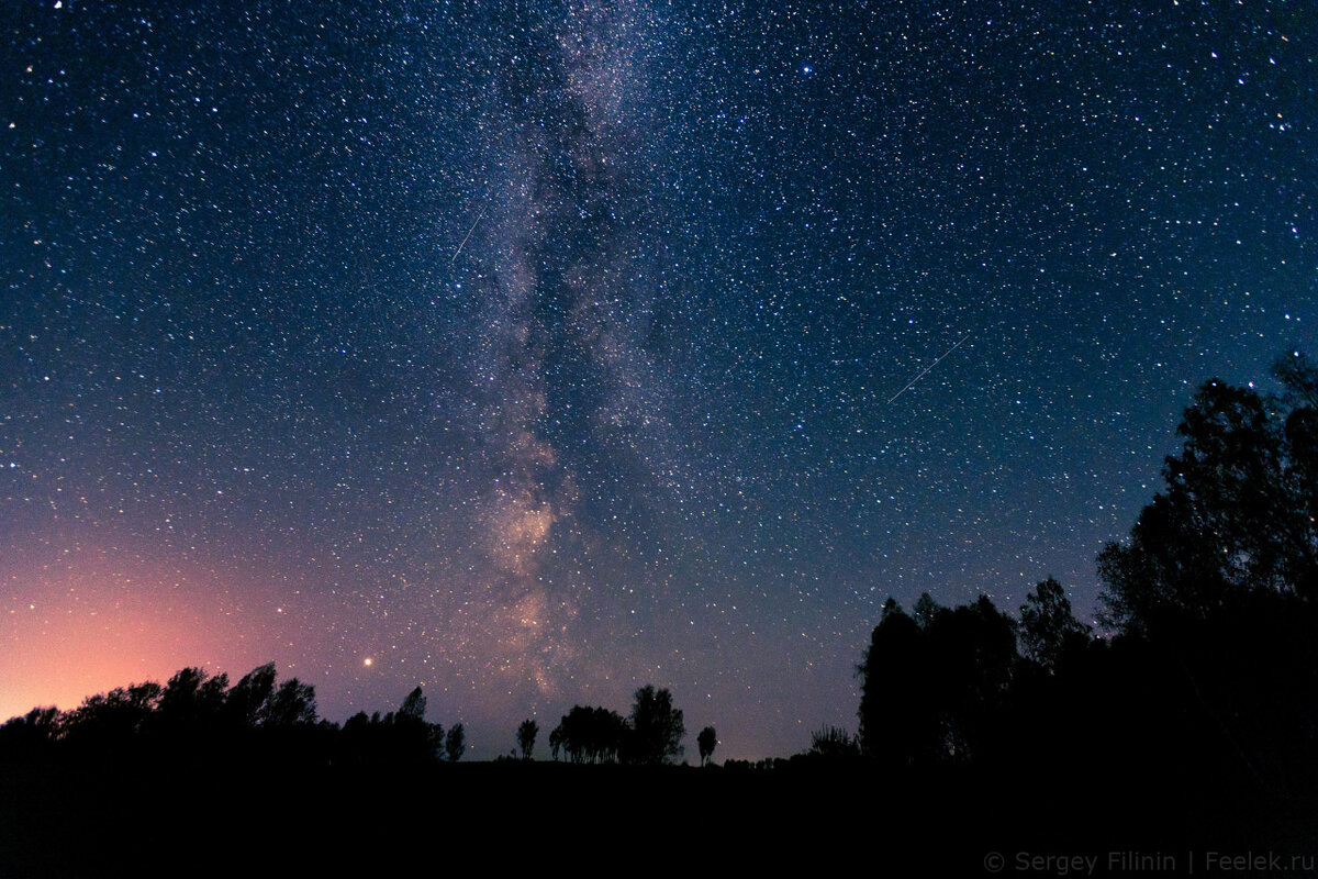 Даже несмотря на близость к поселку и приличную засветку от него, все небо было усыпано звёздами. Миллиардами звёзд! Решил свернуть с трассы в поле и поснимать. Благо вся техника оказалась под рукой.