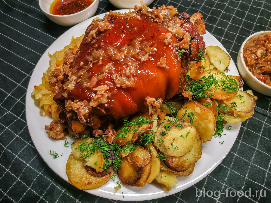 Сегодня у нас роскошный рецепт. Что касается самой рульки, то Шефмаркет привёз уже замаринованную мираторговскую. А вот картошку, баварскую капусту и необычный беконно-пивной топпинг мы честно сделаем самостоятельно.