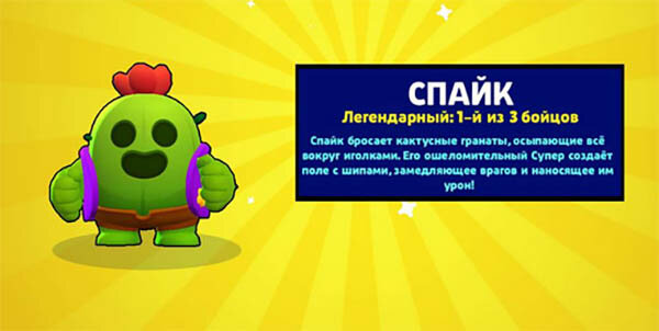 Спайк — единственный немой легу герой. Несмотря на различные мнения, таким он останется навсегда. Это официально подтверждено разработчиками. Выпадает из любого ящика и ценится игроками за большой урон, который наносит в ближнем бою. Хотя имеет мало здоровья. Бьёт врагов своим кактусом, а шипы глубоко ранят врагов. Супером является граната, которая бьёт врагов и замедляет их в определённом радиусе действия;