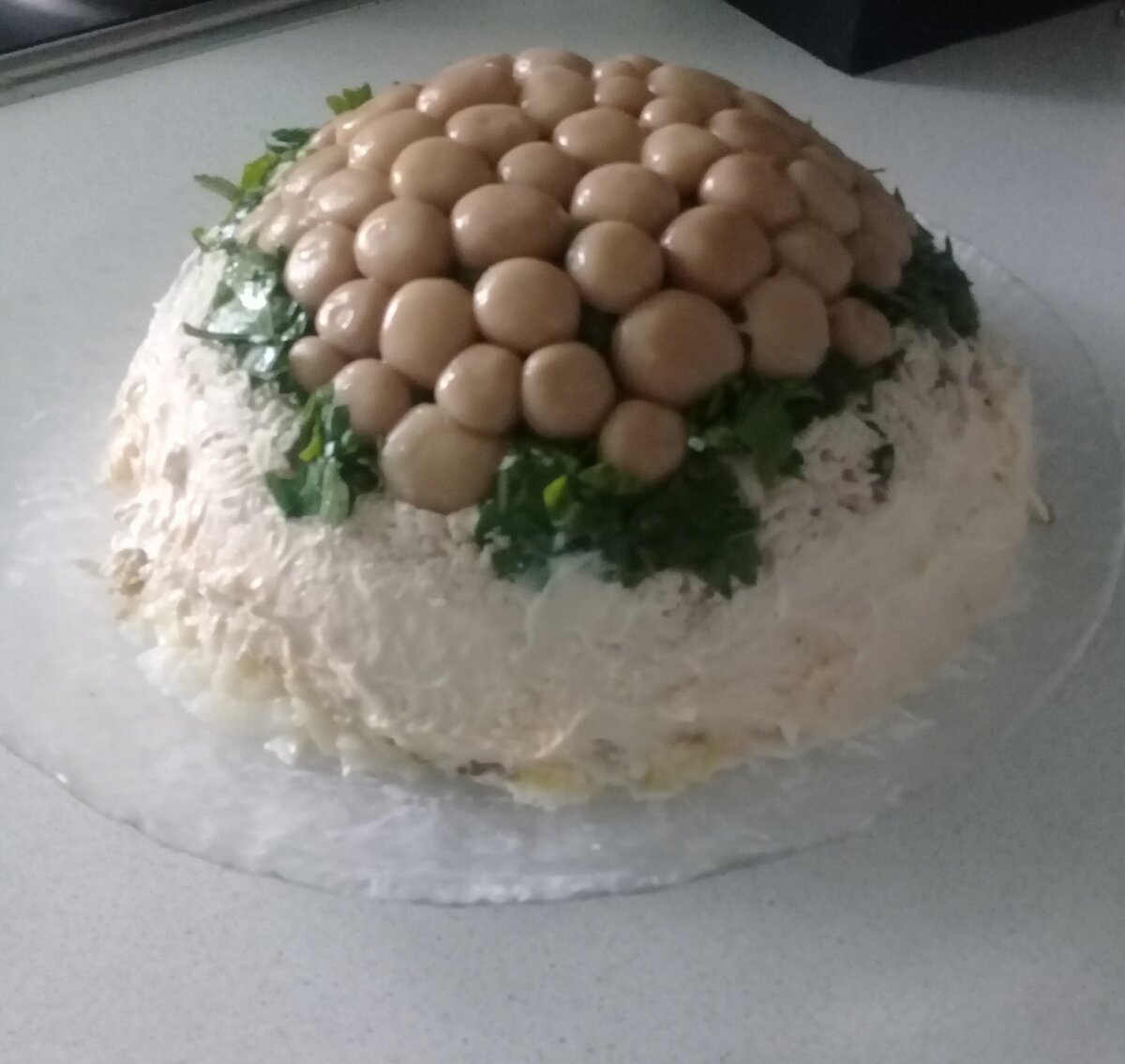 Для начала нам нужно подходящий салатник, застрелить его пищевой плёнкой и смазать растительным маслом. Затем выкладываем целые шампиньоны шляпками вниз. Сверху присыпаем рубленной зеленью. Затем выкладываем курицу. Смазываем майонезом. Следующий слой сыра, затем яйца. Опять смазать майонезом Дальше выкладываем солёные огурцы и слой картофеля. Теперь смазать майонезом и отправить салат настаиватся в холодильник. Перед подачей на стол перевернуть салат на плоскую. тарелку