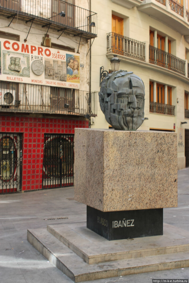 Эти полчаса мы посвятили прогулке по улице Avinguda de Maria Cristina. В испанском я не силен и , где у этого наименования имя, а где фамилия я так и не понял, поэтому и назвал так заметку. А началась прогулка, когда мы неожиданно увидели на улице голову-трансформер с подписью, которую перенести в текст не представляется возможным. Читайте и улыбайтесь испанским наименованиям и именам, так созвучным с нашими интересными словами. Поулыбались, а теперь перейдем к историческому месту города — Рыночной площади (Plaza del Mercado). Это место очень интересно тем, что здесь смотрят друг на друга здания из разных эпох. Это модернистский Центральный рынок (XX в.), барочная церковь Сантос-Хуанес (XVII в.) и позднеготическая Шелковая биржа (XV в.) с ренессансным Консульским павильоном (XVI в.). На этом месте торговля шла с давних пор. В средние века здесь располагался открытый рынок. В 1839 году на месте снесенного монастыря Convento de las Magdalenas для рынка было построено отдельное здание. Вскоре это здание, а точнее навес перестал удовлетворять нуждам растущего города и было решено построить новое здание, которое стоит и поныне.Рынок