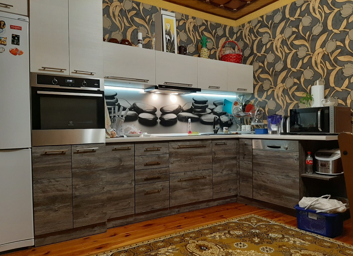 Единственное, что мне более-менее понравилось из всего увиденного - это кухонный гарнитур. Он смотрится вполне достойно и современно - на мой взгляд, такой гарнитур отлично бы вписался в лофт-интерьер. Но вот зачем надо было делать кухонный фартук с фотопечатью каких-то непонятных камней... Намного более уместно смотрелся бы однотонный вариант фартука.