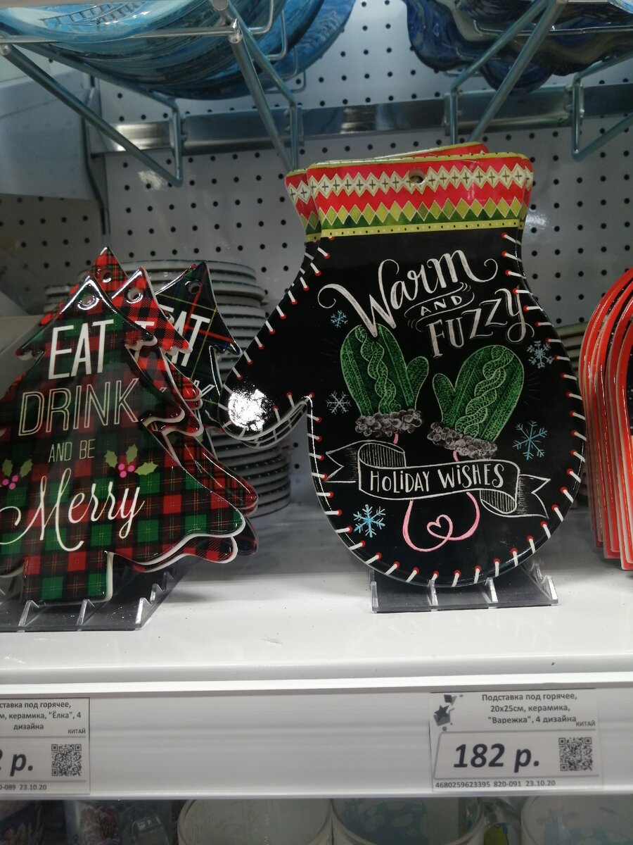 Конечно там огромный выбор новогодних товаров. Их, действительно, очень много. Вот такие подставки под горячее из керамики. Выглядят очень достойно.