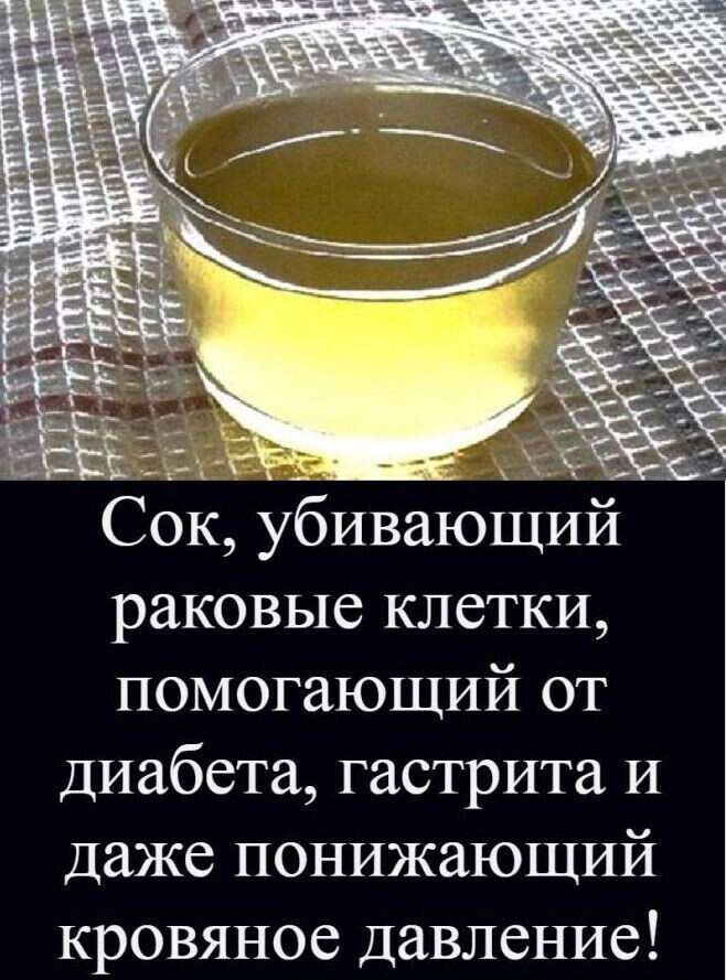 СОК, УБИВАЮЩИЙ РАКОВЫЕ КЛЕТКИ, помогающий от диабета, гастрита и понижающий кровяное давление! Сок, выдавленный из самого обычного картофеля, во многом оказывается более эффективным, чем большая часть современных лекарств. Невероятно, но это так. Он поможет вам снизить вероятность заболеть диабетом, нормализует ваше кровяное давление, а также поможет в профилактике многих других серьезных заболеваний, включая рак. Наши предки знали о пользе сырого картофеля практически с тех самых времен, как начали употреблять его в пищу, но в наш, казалось бы, просвещенный век мы почему-то думаем, что картофель непременно нужно варить или жарить. А ведь этого зачастую делать вовсе не стоит, так как именно в сыром виде картофель является невероятно здоровой и полезной пищей. Но не забывайте, что некоторые картофелины, в каком бы виде вы их ни употребляли, все-таки необходимо чистить перед едой. Недозревшие картофелины с зеленой кожурой, а также плоды картофеля, растущие выше уровня земли, могут представлять опасность для человека. Опасность заключается в том, что в таких клубнях и плодах содержится большое количество соланотоксина, ядовитого для человеческого организма. Однако даже такие клубни можно употреблять в пищу — предварительно очистив. В настоящее время в специализированных изданиях вы можете найти множество статей о целебных свойствах картофельного сока. Среди авторов этих статей — и доктор медицины Джон Лесинджер. Джон Лесинджер считает, что этот сок — лучшее природное лекарство от гастрита, одного из самых распространенных хронических заболеваний в наши дни. Так, Лесинджер советует страдающим от гастрита регулярно употреблять по 1 столовой ложке свежего картофельного сока с небольшим добавлением воды. Это нужно делать за 30 минут перед завтраком, обедом и ужином. Также он считает, что от многих других проблем с желудком может помочь употребление по 50 миллилитров картофельного сока на пустой желудок. Это нужно делать за 30 минут перед обедом и ужином. Исследования доктора Кагамине, профессора Университета Медицины в Аките, Япония, помогли ученым выделить активные вещества, содержащиеся в картофельном соке. И, как оказалось, эти вещества оказывают угнетающее действие на рост опухолей у лабораторных мышей. Результаты его исследований были представлены ученым со всего мира на международном конгрессе о проблемах раковых заболеваний. Да-да, на том самом известнейшем конгрессе, который ежегодно проходит в Германии. Кроме того, в настоящее время исследуется воздействие содержащихся в картофеле веществ на болезни сердца и почек, заболевания сердечно-сосудистой системы, повышенное давление, диабет, люмбаго, ревматизм, и так далее. И даже если у вас нет ни одного из этих заболеваний, вам все равно стоит подумать об употреблении в пищу картофельного сока или сырого картофеля, так как это отличный способ укрепления иммунной системы. Если ваша повседневная деятельность настолько вымотала вас, что вы постоянно чувствуете себя, словно выжатый лимон, пейте сок из одной картофелины среднего размера с добавлением моркови и яблок по утрам и вечерам, и вскоре вы вспомните, что такое радоваться жизни — ведь теперь у вас на все будет хватать сил! Итак, у картофельного сока есть следующие преимущества: Он улучшает иммунитет Помогает телу очи