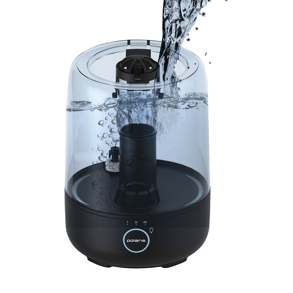 Polaris PUH 6405TF сразу привлекает внимание потребителей стильным дизайном. Прозрачный корпус дополняется синей подсветкой, которая, по отзывам, не отвлекает даже ночью. Конструкция монолитная и надёжная. Есть верхний долив воды, что очень удобно. К сожалению, просто помыть увлажнитель водой нельзя, его нужно протирать губкой. Объем резервуара довольно большой – 4,5 л. Стоя на одном месте, прибор может обработать воздух на 40 м². Работает без отключения недорогой увлажнитель Polaris PUH 6405TF целых 25 часов. Это лучший показатель в нашем рейтинге. К тому же он оснащен функцией автоотключения, а вот ионизации воздуха и обеззараживания воды нет.