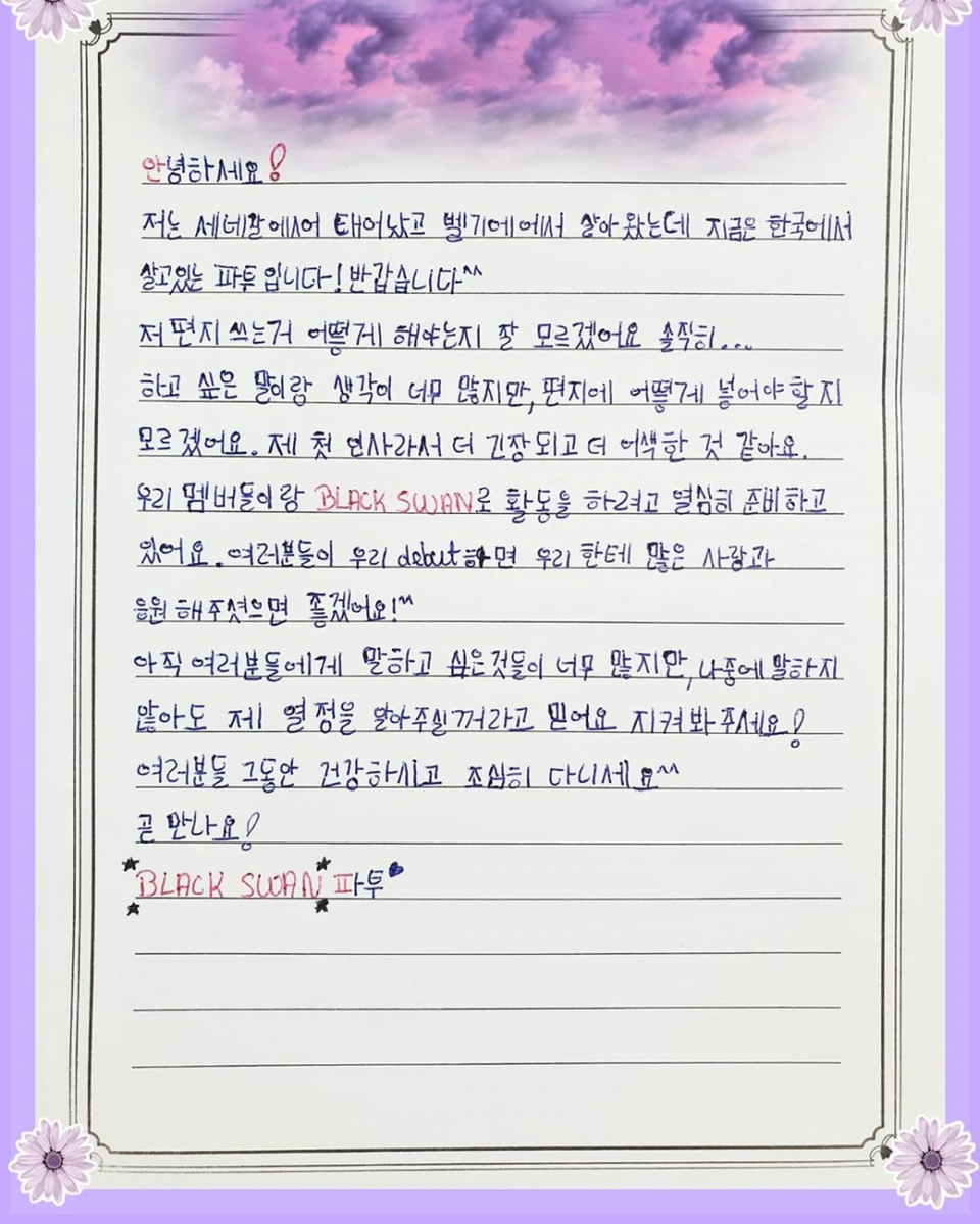 - Совсем недавно я узнала думаю и вам интересно будет почитать эту статью.Что совсем недавно агенством DR ENT. Была выпущена корейская женская группа под названием Black Swan .Если честно ,то я впервые вижу корейскую группу состоящую из разных национальностей .Группа состоит из пяти безумно красивых девушек.Каждая участница красива по своему ,каждая уникальна .Расскажу про состав этой интересной .Фэту она занимает такие позиции как :Главный репер,главный танцор .Хеми ее позиция в группе : главная вокалистка,рэпер.Джуди ее позиция:вокалистка.Енхын Ну и последняя участница это Лея ее позиция это:макнэ,ведущий рэпер,вокалистка.А теперь немного расскажу про каждую из участниц ,хотя и информации про каждую из них тоже мало ,но расскажу ,что мне удалось узнать