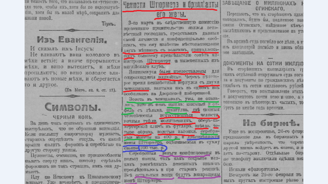 В ней говорится, что 3 марта в Следственную Комиссию прибежал некий господин и сообщил, что знает, где Штюрмер прячет два мешка с золотом.