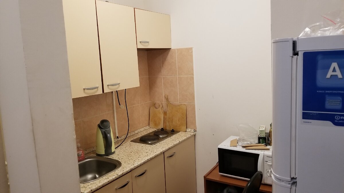 Сразу видно, что до нас здесь жили какие-то люди, которых в спешном порядке выселились на время карантина. Даже продукты не успели свои забрать из настенных шкафов в кухне.
