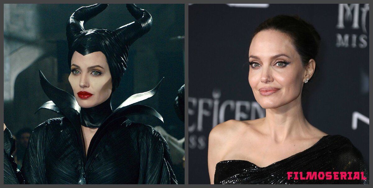 Что делали гримеры? Анжелина настояла, что не только рога сделали, но и специальные накладки на лицо. Актриса хотела видоизменить нос, выразить скулы, чтобы одним взглядом на Малефисенту было понятно - она злая колдунья. Были созданы накладки для носа, ушей и скул, состояли они из силикона, наполненным гелем. Каждый день перед съемками уходило 4 часа, прежде чем милое лицо Джоли, превратило в тоже милое, но злобное лицо могущественной ведьмы - Малефисенты.