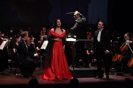 Первым из певцов на сцену вышел тенор Алексей Татаринцев: каватина Ромео из оперы Гуно – давно и мастерски сделанный номер (опера в репертуаре его родного театра). Лирическая проникновенность и экстатические, торжествующие верха буквально положили зал на лопатки: вокальное начало вечера оказалось ударным. После тенорового звона меццо Агунда Кулаева разлила по залу негу, пастозный, чуть приторный эротизм в третьей арии Далилы: томный тембр ее чарующего голоса идеально подходит для хрестоматийной соблазнительницы. Вместе певцы-супруги исполнили полный страсти дуэт Кончаковны и Владимира Игоревича из оперы Бородина: прекрасный ансамбль с идеальным слиянием голосов подарил незабываемое впечатление.