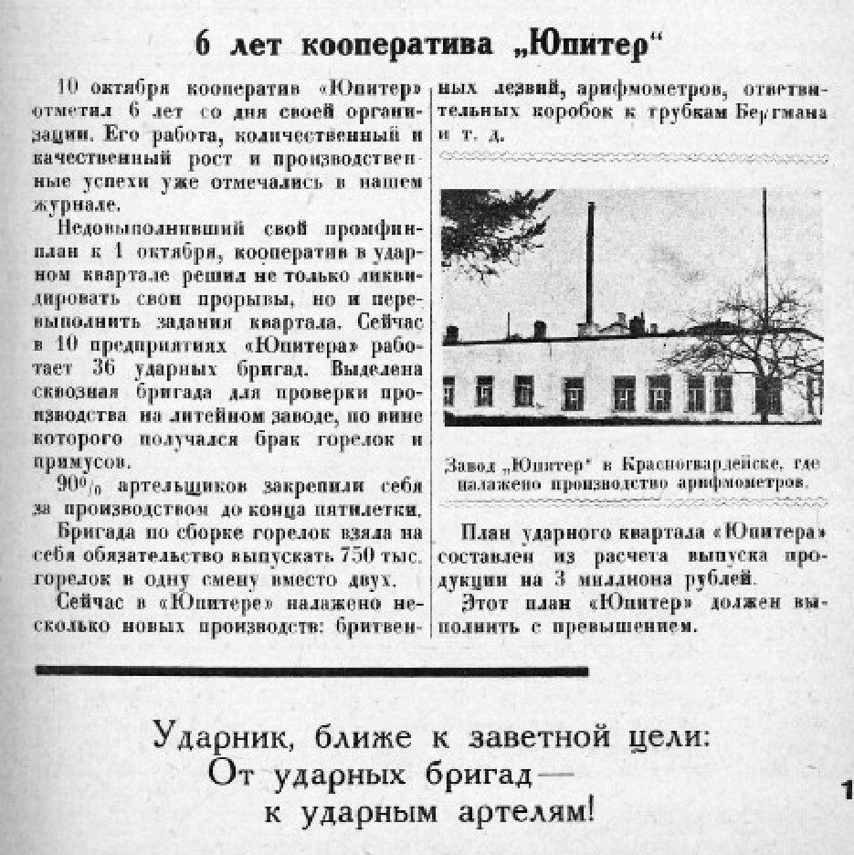 «Между тем, процветание артели обеспечило не только следование кооперативным принципам. В условиях упрочения партийной диктатуры, авторитарного режима в середине второй половины 1920-х гг. кооперативы стремились сблизиться с представителями властных структур, найти у них защиту. «Юпитеру» это удалось. На одном из общих собраний кооператоры избрали всесоюзного старосту М. И. Калинина почетным членом своего коллектива. Оказалось, что в 1916 г., находясь на нелегальном положении и проживая в Петрограде по чужому паспорту, Михаил Иванович ни на один завод поступить не мог и несколько месяцев работал в «Первой трудовой артели слесарей-механиков». В «Юпитере» трудились некоторые механики из этого коллектива. Они-то и предложили избрать председателя ЦИК СССР почетным членом. Пожаров (создатель «Юпитера») написал Калинину. Тот дал согласие, обязался подчиняться уставу и, что очень важно, принял на себя ответственность по обязательствам и убыткам артели…».