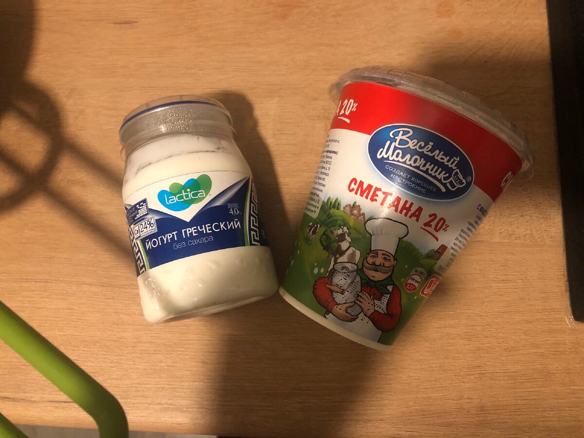 Смешиваем сметану и греческий йогурт и выкладываем их на марлю.