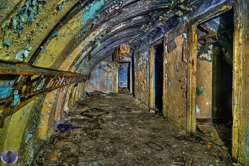 Один из блоков с несколькими кабинетами был выкрашен в жёлтый цвет. Какие службы в нём размещались сказать сложно, но судя по кабельной полке, скорее всего что-то из связи.