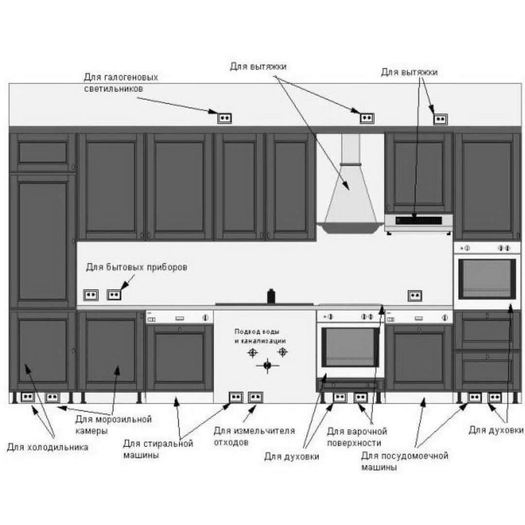 СТИРАЛЬНАЯ И ПОСУДОМОЕЧНАЯ МАШИНЫ. Если в соседнем отсеке у вас раковина - то можно сделать на уровне 300 мм от пола, под раковиной. Розетки с водозащитой. Если рядом раковины нет, то делаем в СОСЕДНЕМ отсеке внизу на уровне 5 см от пола. Таким образом будет доступ внизу под гарнитуром.