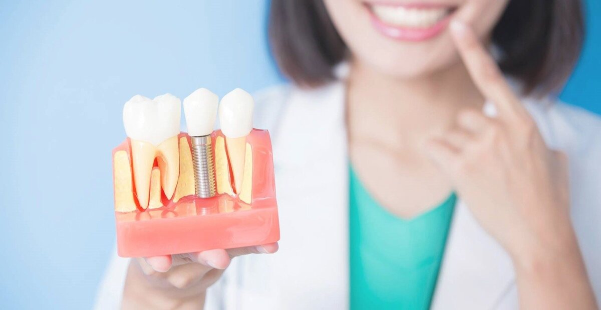 Имплантация — это восстановление отсутствующих зубов или ряда зубов с помощью титановых винтов. То есть устанавливается имплантат, затем, по истечении какого-то времени, устанавливаются элементы соединяющие имплантат с коронкой, которые называются абатмент, и уже на абатмент устанавливается непосредственно коронка.