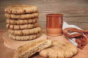 Тонко раскатать тесто в пласт и вырезать широким стаканом лепешки. Лист смазать маслом, выложить на него лепешки, наколоть вилкой, смазать маслом и посыпать тмином. Выпекать в духовке при 180 градусах до зарумянивания.