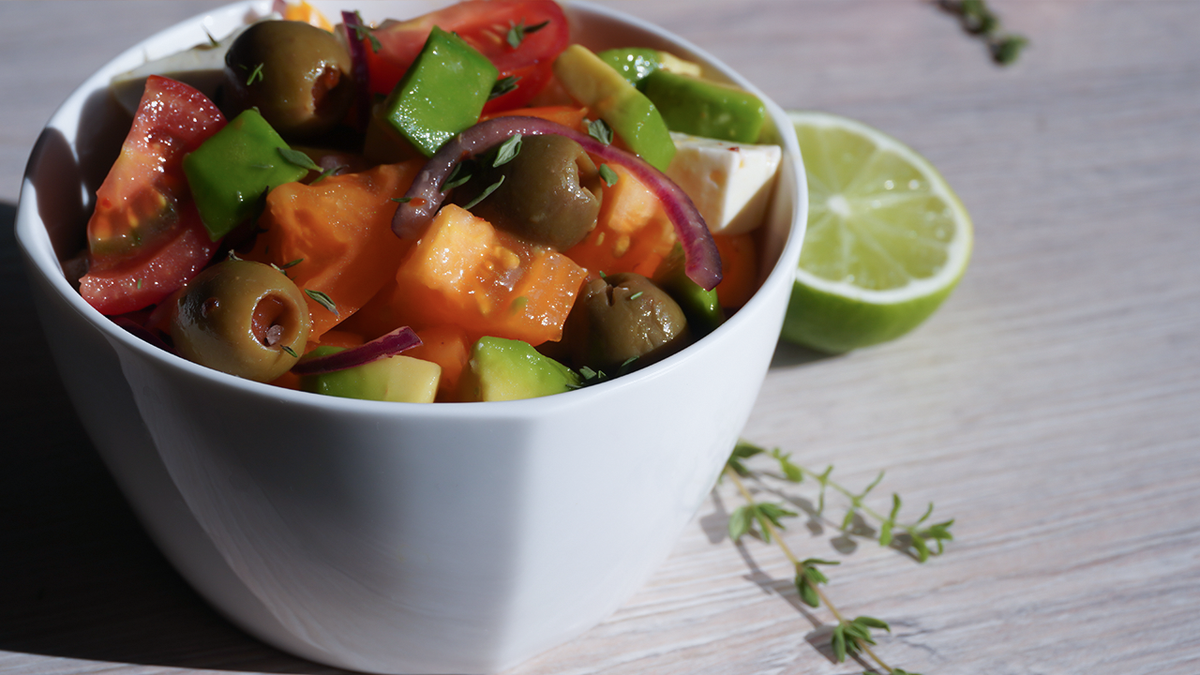 Греческий салат с авокадо (на 1 небольшую миску)
