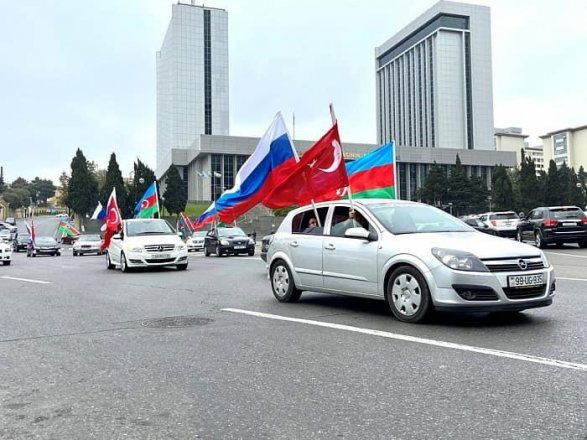 В Баку русская диаспора устроила флешмоб. Устроители проехали по улицам Баку с флагами Азербайджана, России, Турции.