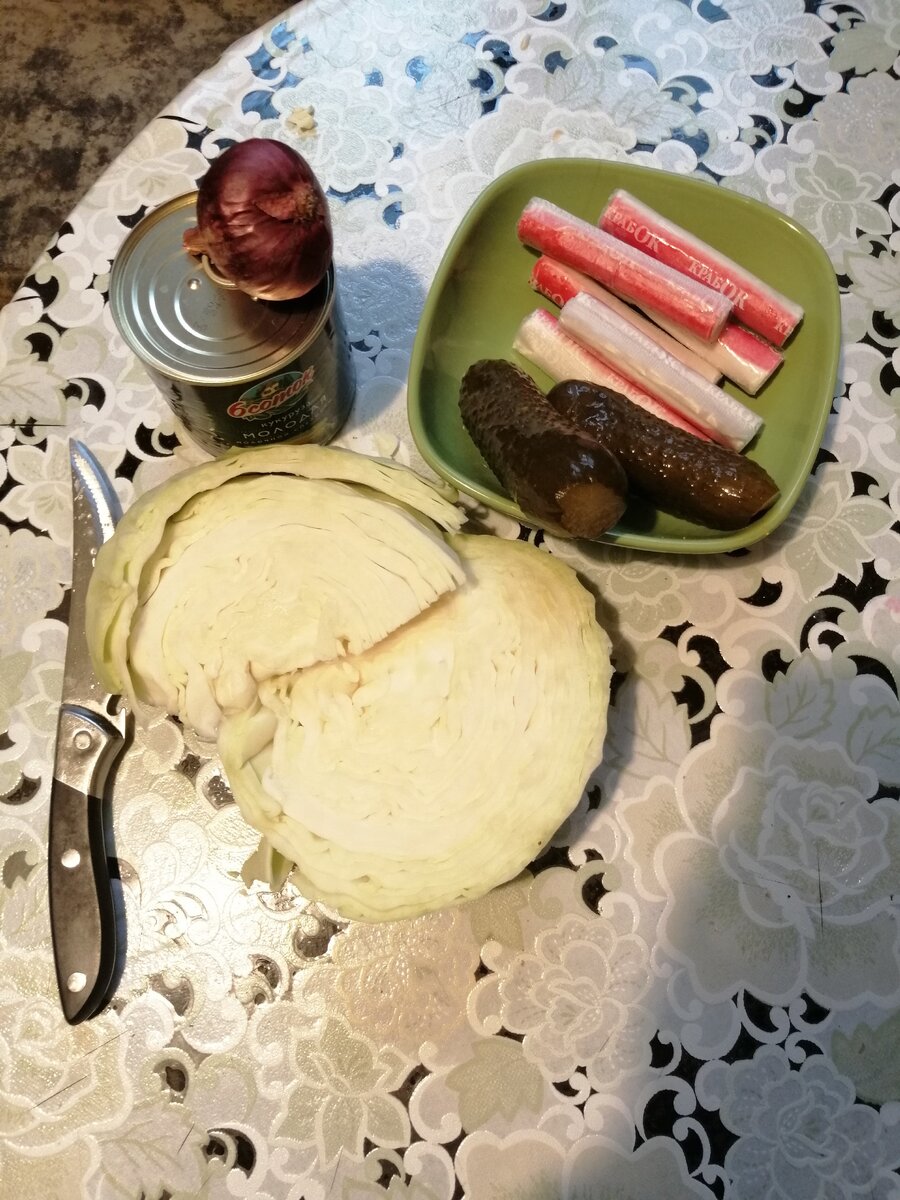 Капуста, репчатый лук, крабовые палочки,пара соленых огурцов, сладкая кукуруза и майонез.