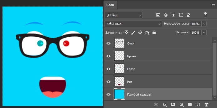 Теперь поговорим о перемещении слоев в палитре слоев. На данный момент, если перечислять сверху вниз, то у меня такой порядок размещения слоев: очки, брови, глаза, рот, голубой квадрат. И все вместе они образуют симпатичный голубой аватар. Перейдите на палитру слоев, встаньте на слой «глаза», зажмите кнопку мыши и переместите его на самый вверх на место слоя «очки» (при этом у вас должна была появиться захватывающая рука).
