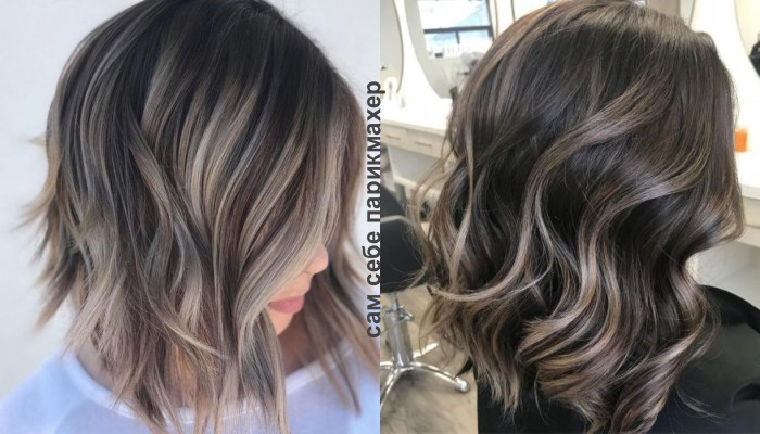 Балаяж на темные волосы в пепельно-грибных оттенках можно сделать чуть холоднее или чуть теплее по тону. Подбирайте гамму исходя из ваших предпочтений, основной массы волос и тона кожи.
