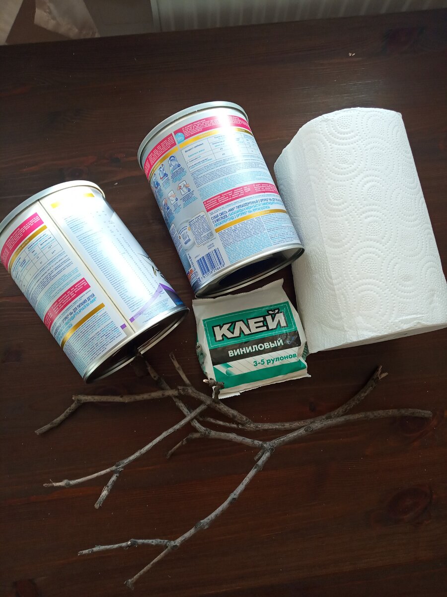 Нам в одной банке от детской смеси по центру нужно вырезать круг. Вторую разрезать на две части. Теперь мы склеиваем банку с отверстием и одну часть от второй банки ( я брала не половину банки, а немного меньше, примерно 1/3). Так же к ним приклеиваем веточки, фиксируем их молярным скотчем и даем высохнуть.