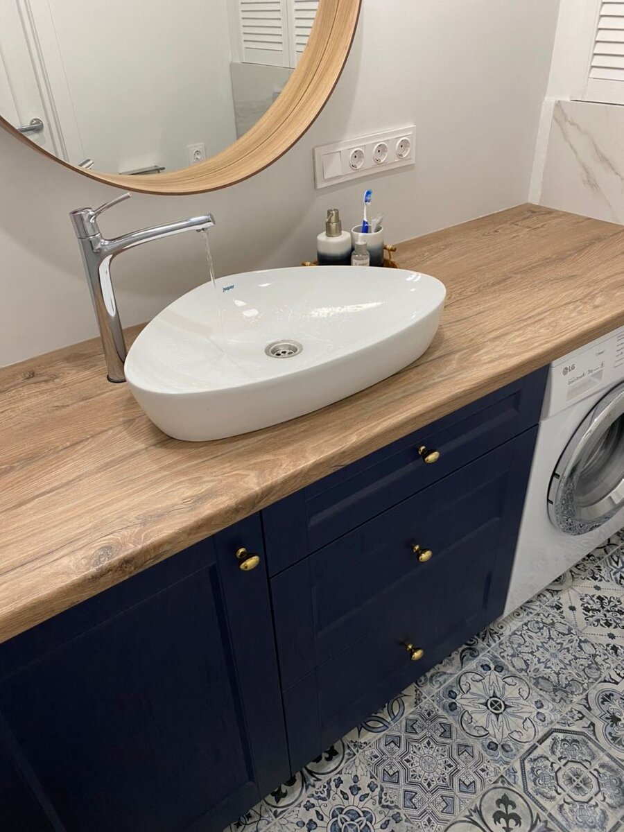 Еще до начала своего ремонта, мы с супругой точно знали, что хотим установить в ванную комнату столешницу с накладной раковиной. Более того, мы хотели разместить под одной плоскостью столешницы и стиральную машинку. Вот тут и столкнулись с отзывами людей, которые писали о том, что из-за стиральной машинки высота столешницы окажется выше стандарта, поэтому накладная раковина будет расположена выше нормы. Но поскольку других вариантов размещения мебели и сантехники, в нашей маленькой ванной комнате, у нас не было, мы решили действовать так, как изначально запланировали. Вот такая зона с общей столешницей у нас получилась. Накладную раковину-чашу я взял минимальной глубины, чтобы края раковины оказались как можно ниже и не мешали рукам. Помню как читал некоторые отзывы, якобы руки неудобно выгибать из-за высокого борта чаши и что вода может по локтям стекать вниз. Но по факту, ничего такого не происходит. По локтям вода не стекает и пользоваться раковиной очень удобно. Высота столешницы