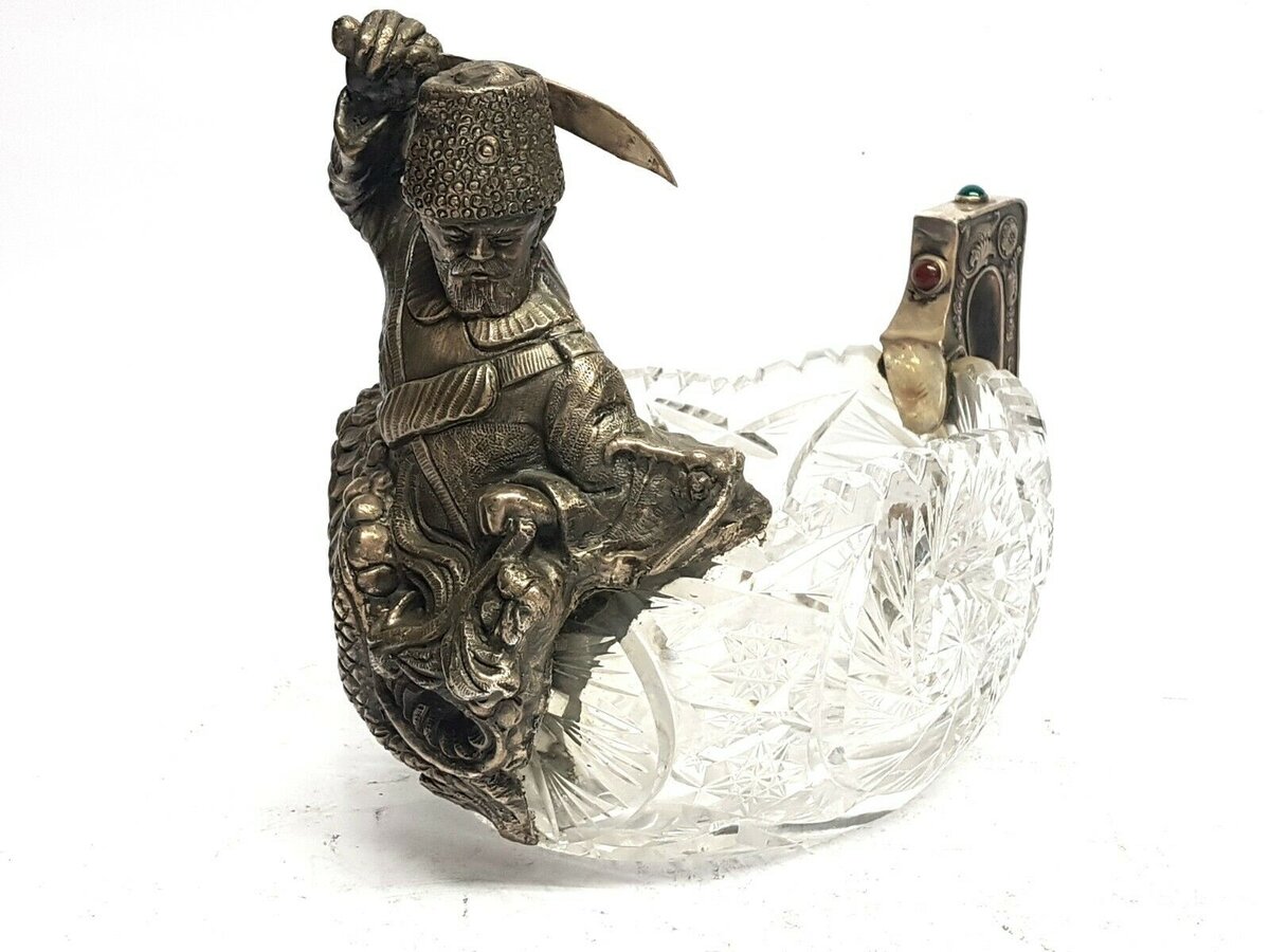 1. Хрустальный ковш украшенный серебром. Передняя часть украшена фигурой лихого казака в атаке. На клинке имеется 84 проба и клеймо мастера СТ. Ручка инкрустирована драгоценными камнями.