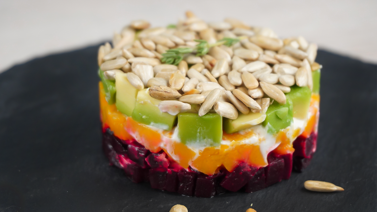 Авокадо нужно нарезать на кубики размером как и тыква со свеклой. Для этого салата будут идеальны кедровые орешки, но и с жареными семечками подсолнуха тоже получается очень вкусно и бюджетно!