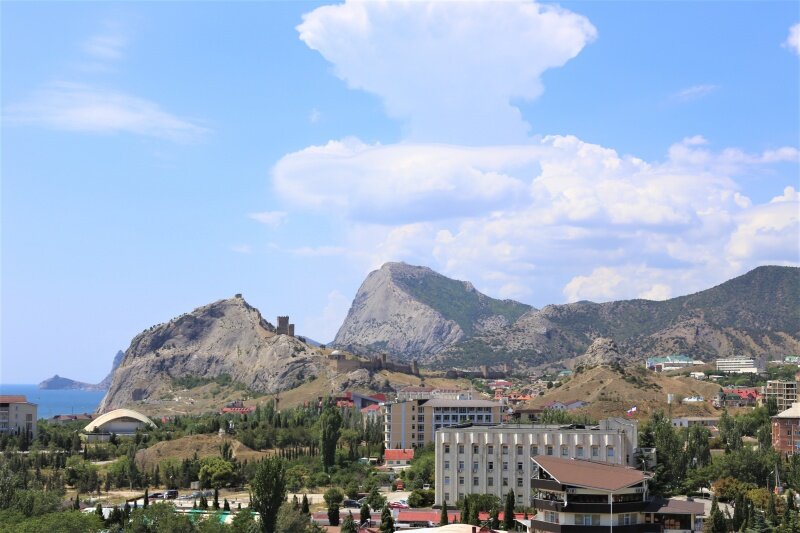 Судакская крепость / Генуэзская крепость - крепость в городе Судак (Крым), построенная генуэзцами как опорный пункт для своей колонии в северном Причерноморье. Крепость располагается на Крепостной горе (высота 157 м), которая также именуется Дженевез-Кая (крымско-тат. Cenevez Qaya — «генуэзская скала»). По своему происхождению гора является древним окаменевшим коралловым рифом и представляет собой пологий с севера и обрывистый с юга конусообразный массив, который вдаётся в Судакскую бухту Чёрного моря мысом Кыз-Кулле-Бурун (крымско-тат. Qız Qulle Burun — «мыс девичьей башни»). Площадь крепости почти 30 гектаров.