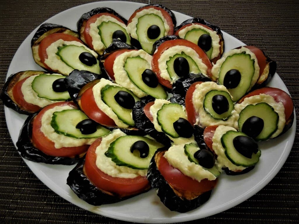 На тарелку выкладываем баклажаны, сверху помидоры, затем сырную смесь, огурец и маслины. Убираем закуску в холодильник на 30 минут. Закуска "Павлиний хвост" готова.