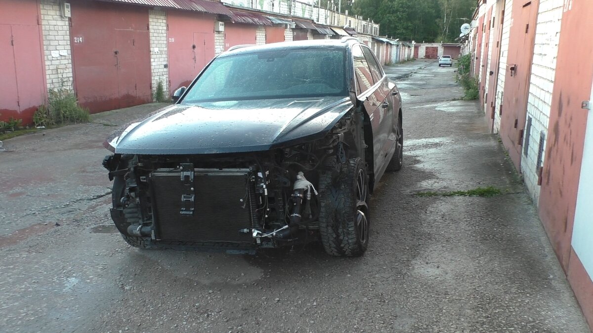 Всем привет. Сегодня рассказ про ремонт третьего Туарега. С виду все не так уж страшно. Слегка мятый алюминиевый капот, мятые передние крылья, не очень хорошо установленный донорский передний бампер, на левом боку рваные коцки. На крыше в районе ветрового стекла и на левой стойке имеются вмятины, самое неприятное, что тут все алюминиевое. По нутрянке основное повреждение получила левая направляющая крыла, на ней большая складка. И, как уже известно, плохо стоящий новый подрамник, поэтому будем ставить на стапель.