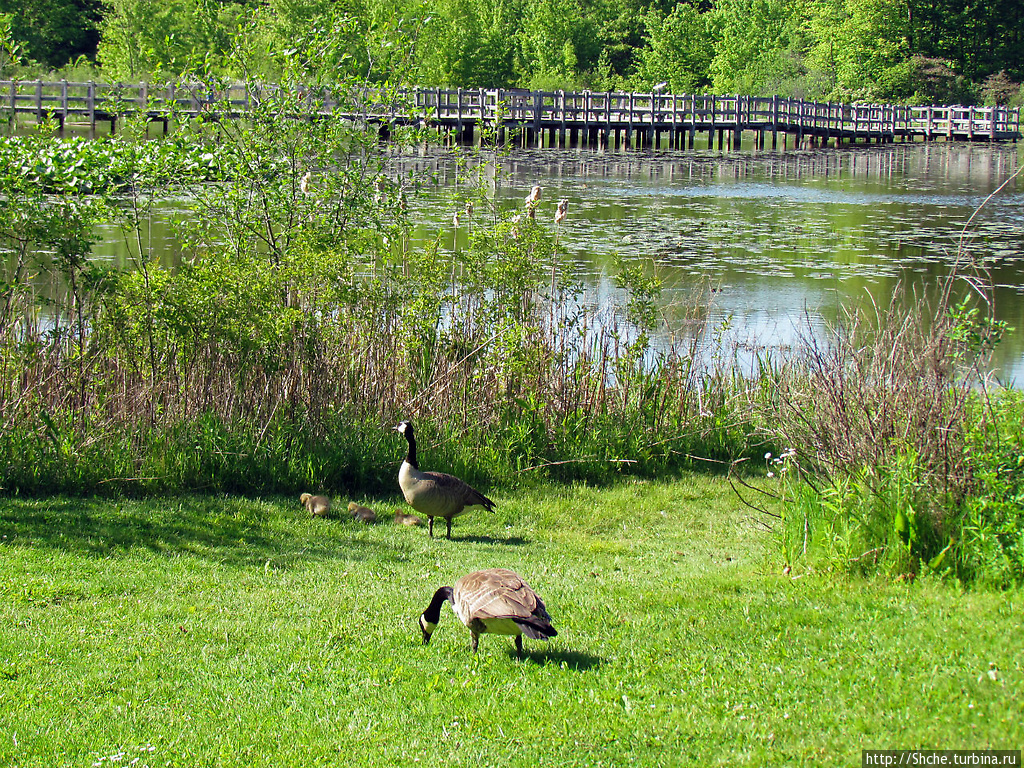 Только подойдя к озеру Озеро в парке North Chagrin Reservation под Кливлендом, наши друзья пришли в состояние некоторого возбуждения. Оказалось, на берегу озера мирно паслась семейка диких канадских гусей. Мы, как не местные, на все смотрим по-другому, а вдруг это дело обычное, гусей тут тысячи. че возбуждаться. Но, по поведению друзей понял, что нам