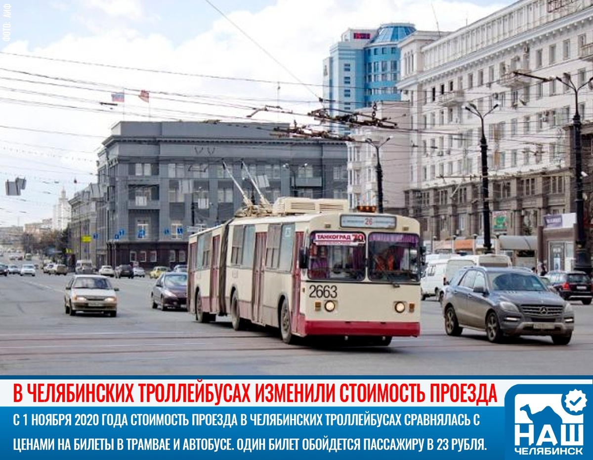 С 1 ноября 2020 года стоимость проезда в челябинских троллейбусах поднялась до 23 рублей, вместо 20 рублей. Таким образом, цена проезда в троллейбусах сравняется с ценой в трамваях и автобусах, которые уже несколько лет возят пассажиров за 23 рубля.