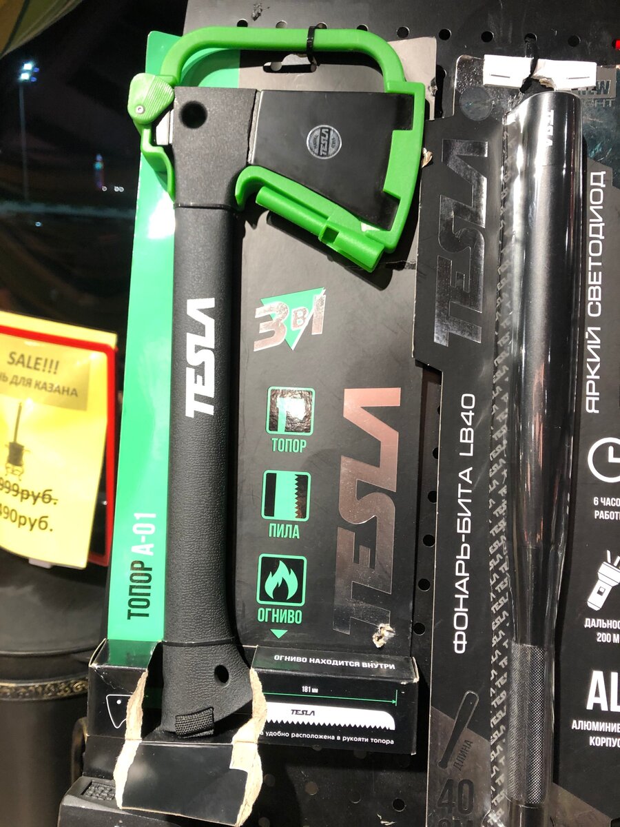 Заправляя свой автомобиль после дальней дороги в лес, на обратном пути в город, я заехал на АЗС где можно не только заправиться, поесть и помыть машину, но так же купить вот такой топор.