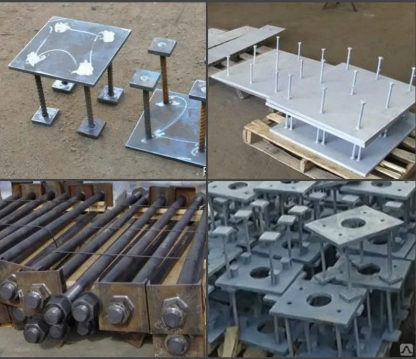 - Болт с анкерной плитой: работа происходит перед заливанием бетона, снизу – металлическая пластина.