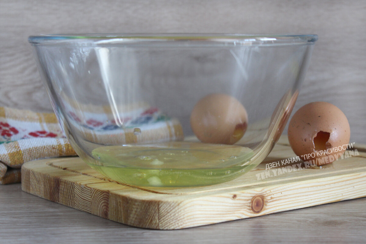 В чистую стеклянную чашку поместить белки, отделив их осторожно от желтков.