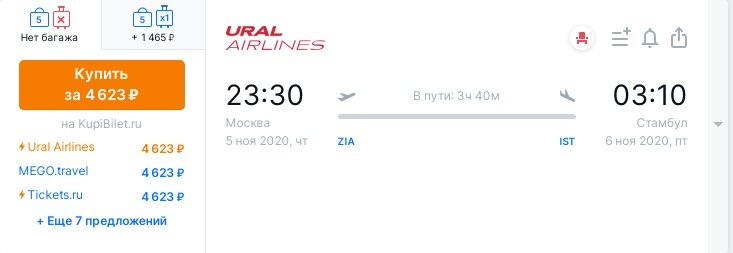 Вылет в Стамбул из Москвы 19.11 (есть и другие даты), но при возврате 1 декабря цена за человека "туда-обратно" от 7231 рубля!