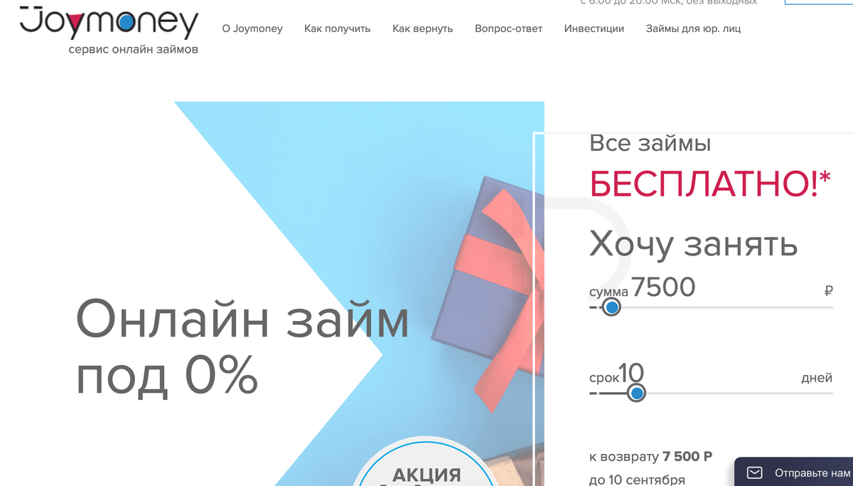 - Сервис быстрых онлайн займов Joy.Money - заполни заявку и получи деньги на карту за 15 минут!