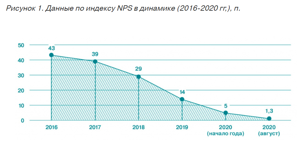 По данным НАФИ, индекс лояльности россиян к банкам за последние 5 лет опустился с 43 пунктов в 2016 году до 1.3 пункта в августе 2020.