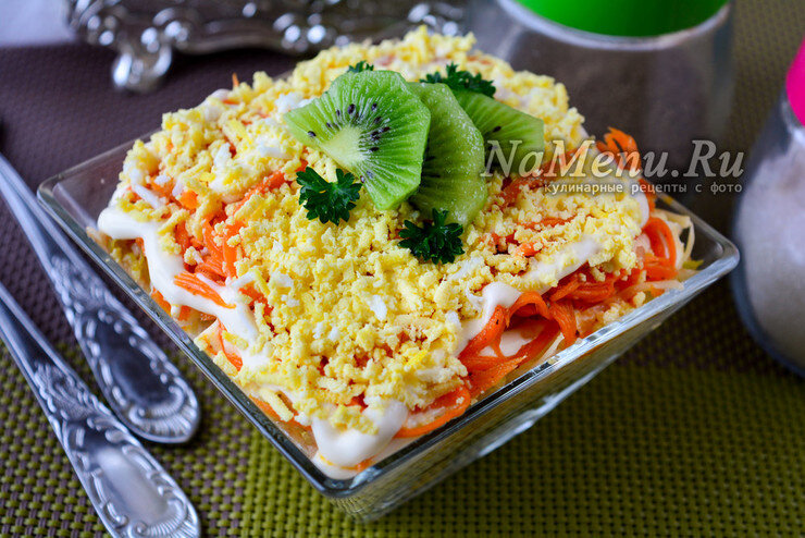 🥕Кладем маринованную корейскую морковку. Натираем желтки и даем салату пропитаться минут 20 в холодильнике